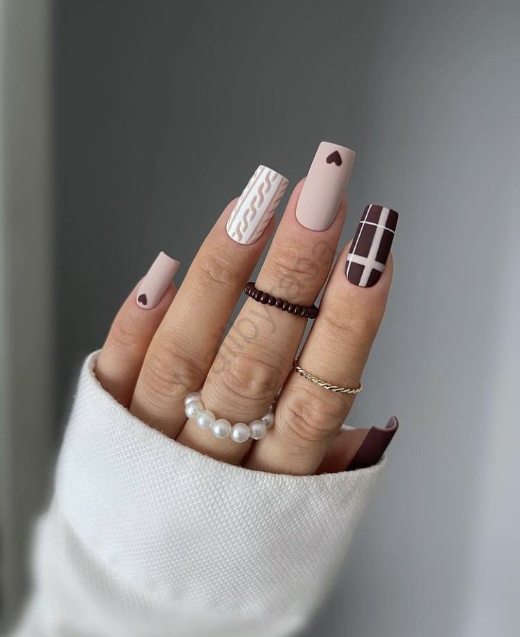 - چهارخانه شکلاتی (Plaid/Tartan): روی انگشت حلقه، خطوط سفید روی زمینه قهوهای تیره، یک طرح چهارخانه کلاسیک و شیک ایجاد کردهاند که با پالتوهای پاییزی عالی ست میشود (مشاهده ناخن مصنوعی طرح دار).