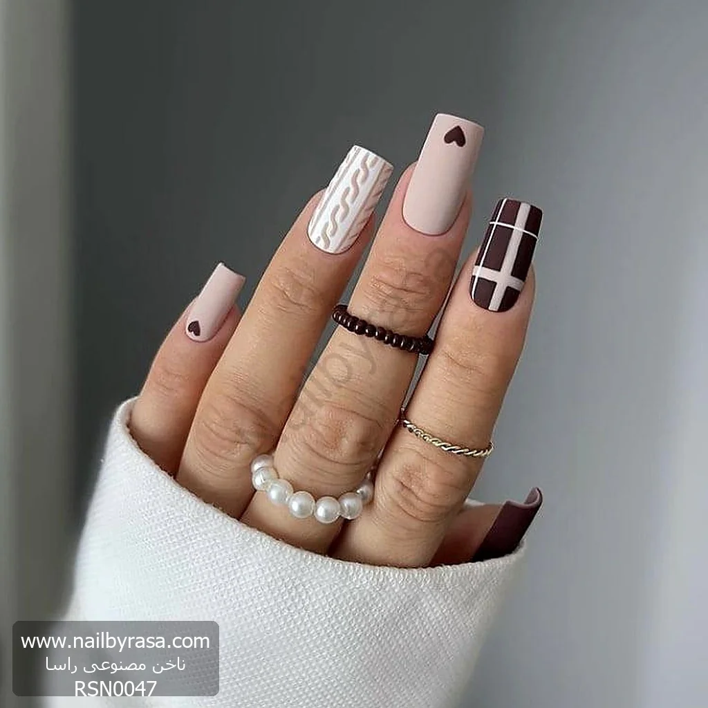 - قلبهای مینیمال: روی انگشتان دیگر، قلبهای کوچک قهوهای روی زمینه نود قرار گرفتهاند تا لطافت و زنانگی را به این ست اضافه کنند (لینک به ناخن مصنوعی قهوهای).