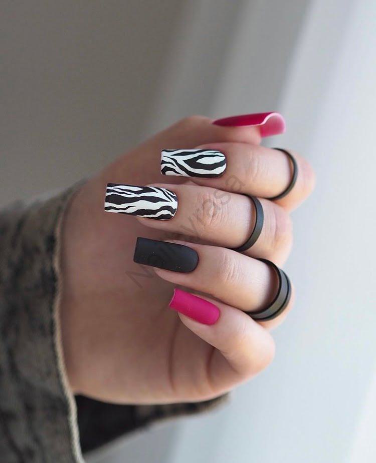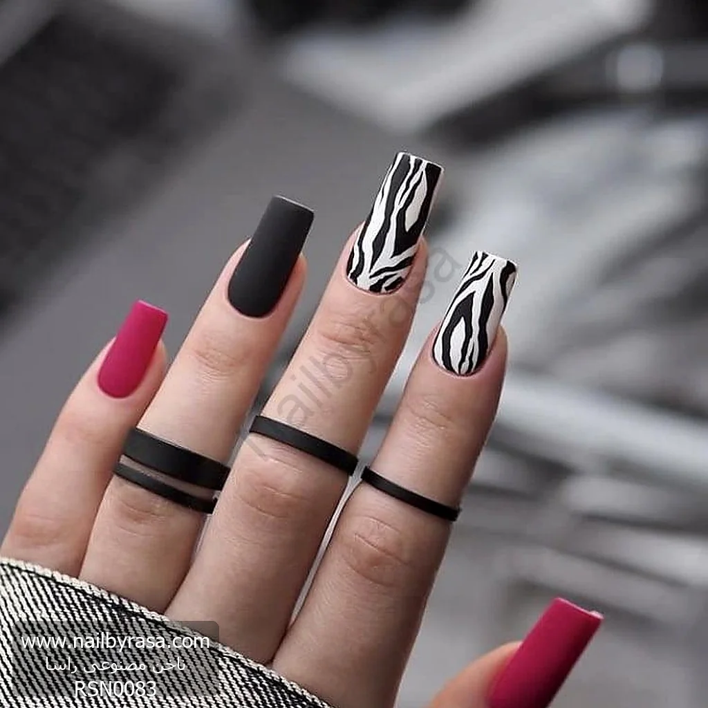 - انفجار رنگ سرخابی: استفاده از رنگ سرخابی در کنار سیاه و سفید، یک حرکت هوشمندانه در طراحی (Color Blocking) است که سردی طرح گورخری را از بین برده و به آن انرژی میبخشد (لینک به ناخن مصنوعی صورتی/سرخابی).