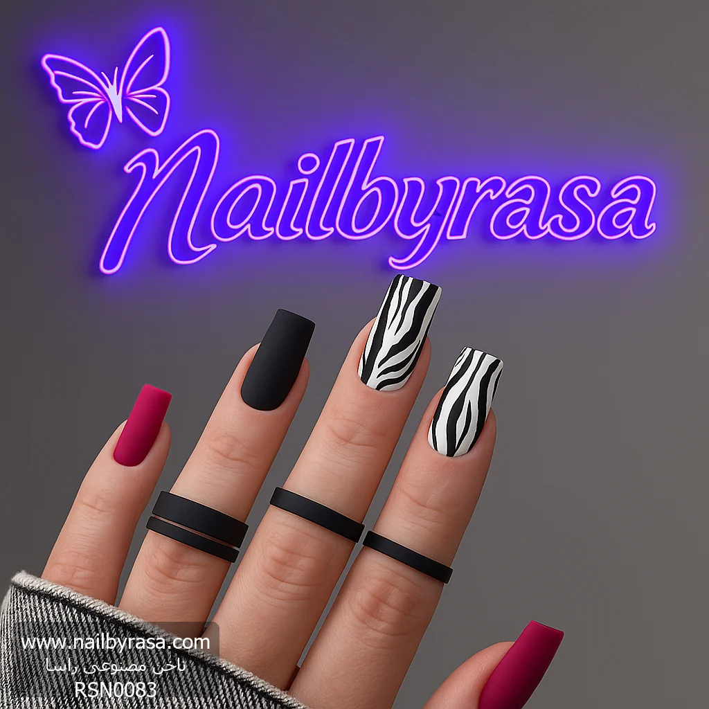 - گورخری کلاسیک: خطوط سیاه و سفید نامنظم روی دو ناخن، جذابیت بصری بالایی دارند و استایل شما را بسیار “Edgy” و قدرتمند میکنند (دسته ناخن مصنوعی طرح دار).