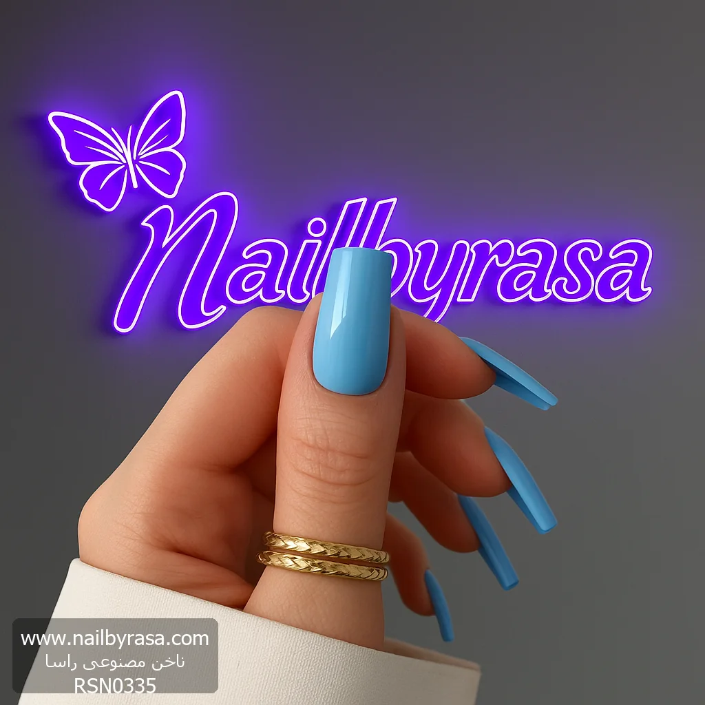 ناخن مصنوعی رنگی ساده راسا رنگ آبی پاستیلی فرم مربع براق