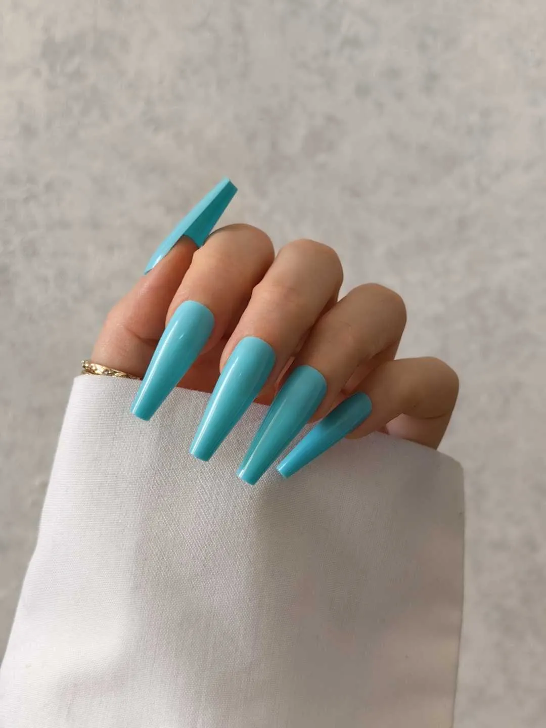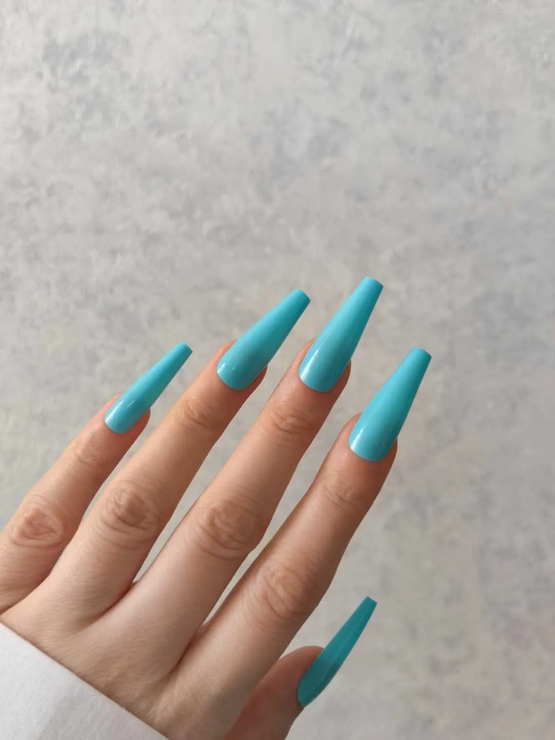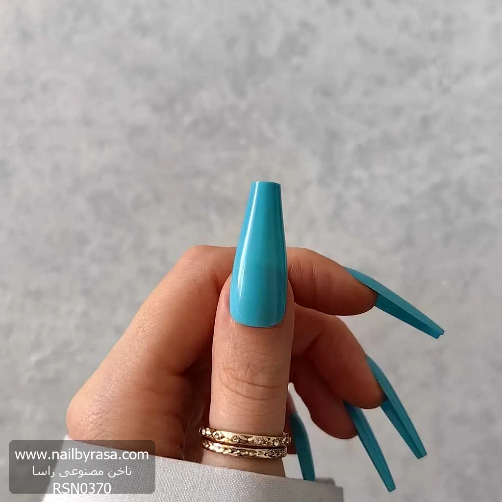 ناخن مصنوعی رنگی ساده راسا رنگ آبی پاستیلی گلدانی بلند براق