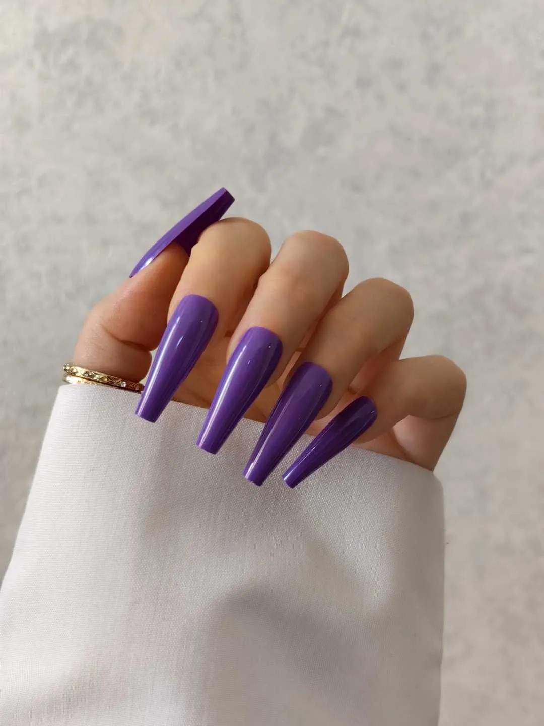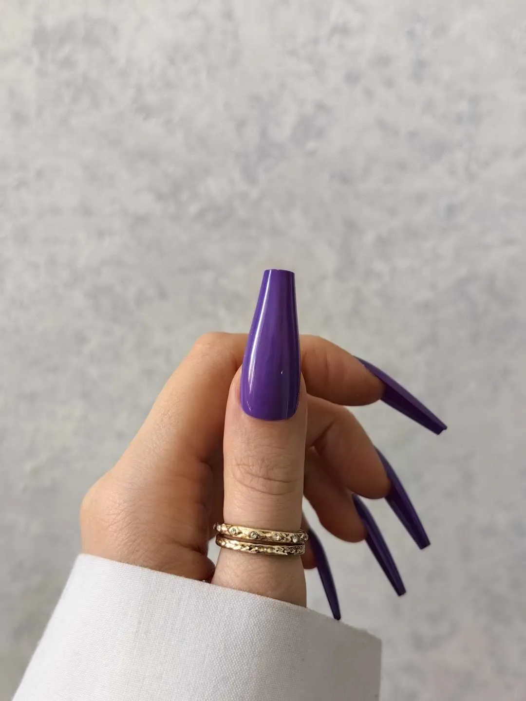 ناخن مصنوعی رنگی ساده راسا رنگ بنفش پررنگ گلدانی بلند براق