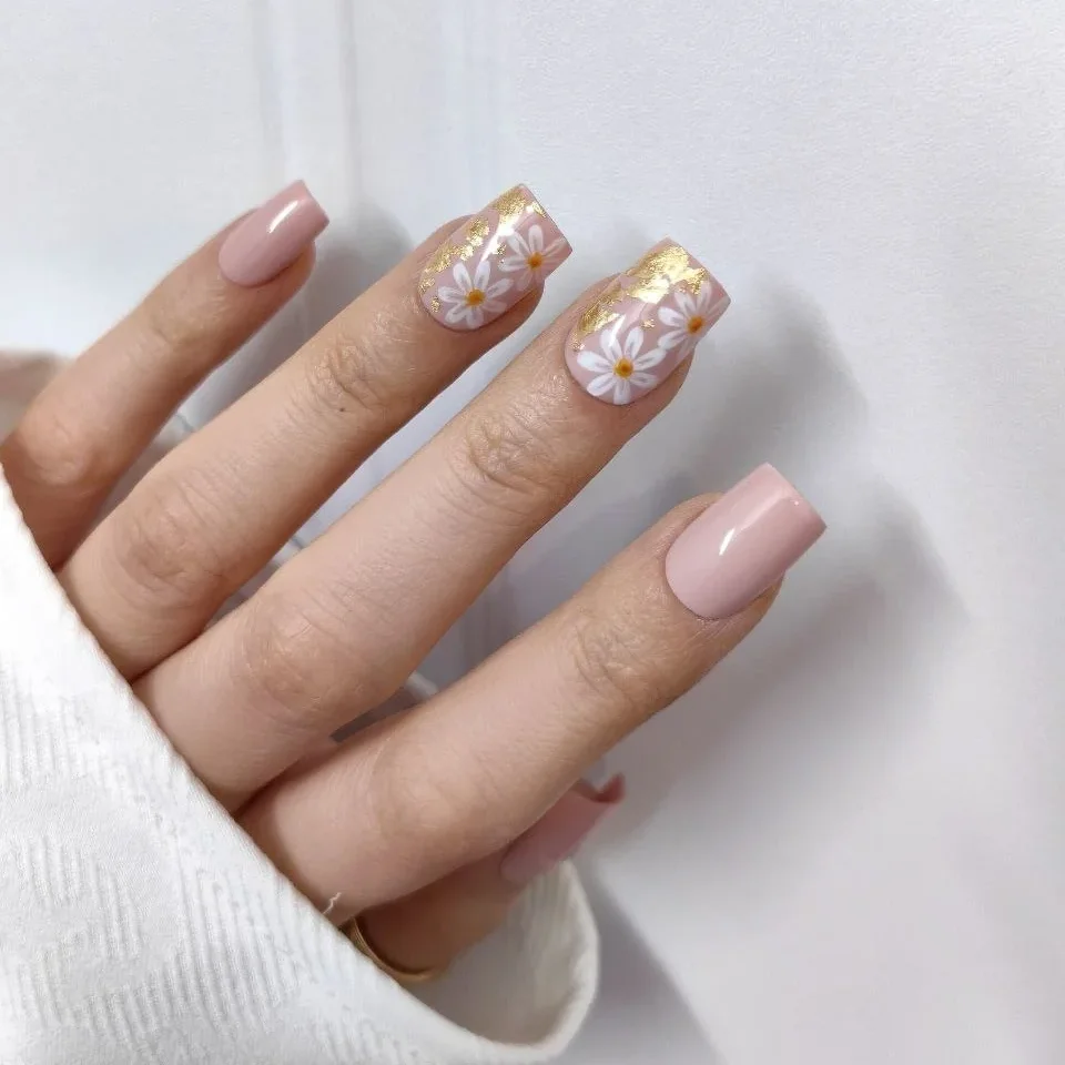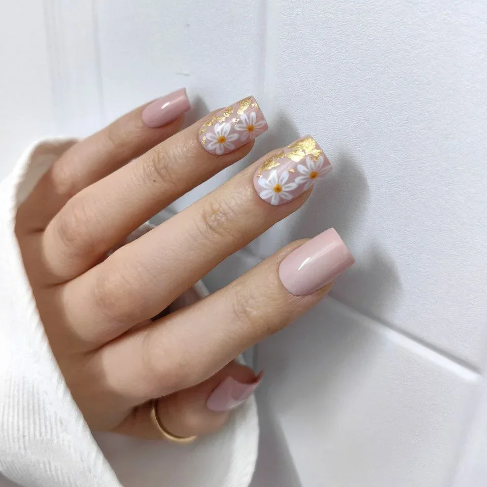 - گلهای بابونه (Daisy Art): گلهای سفید با مرکز زرد که نماد پاکی و شروع دوباره هستند، با قلمموی ظریف روی ناخنها نقاشی شدهاند. این طرح یکی از ترندهای ثابت فصل بهار و تابستان است (دسته ناخن مصنوعی طرح دار و گلگلی).