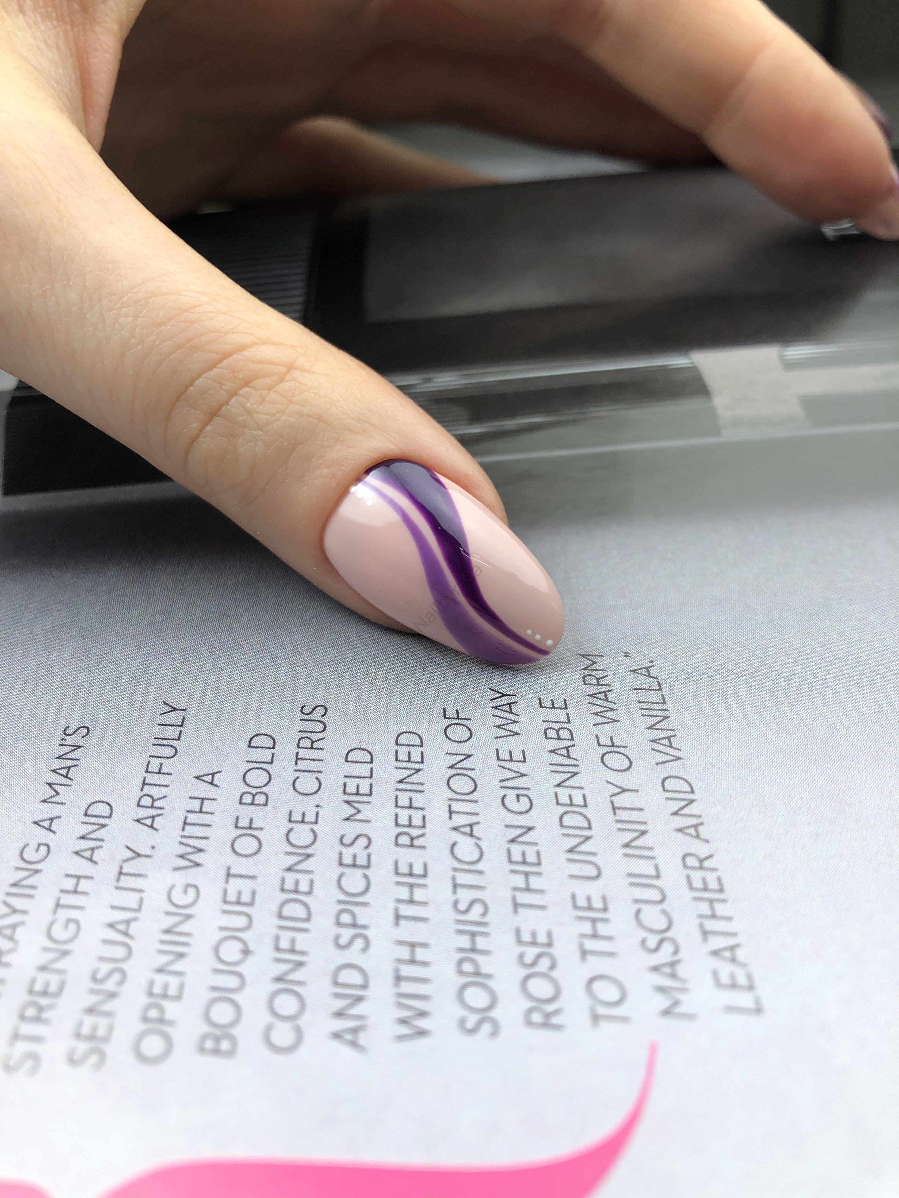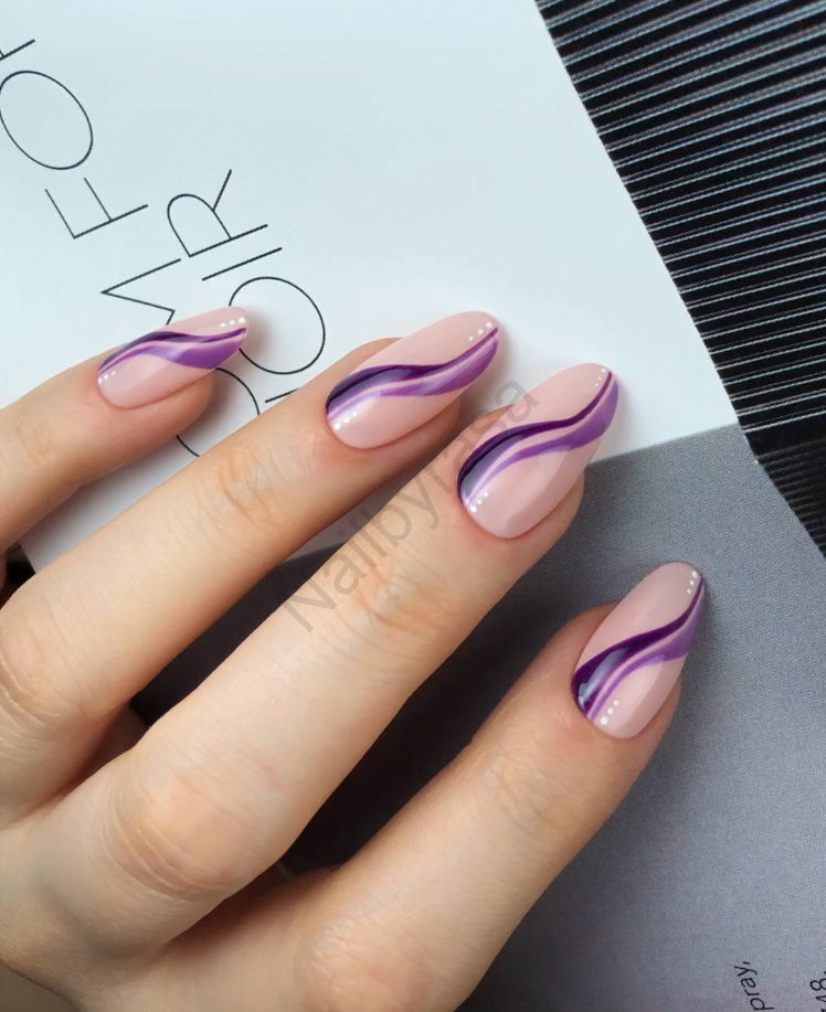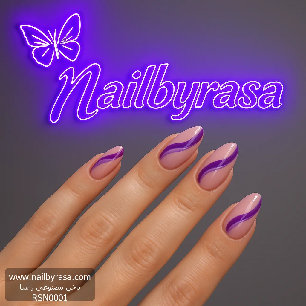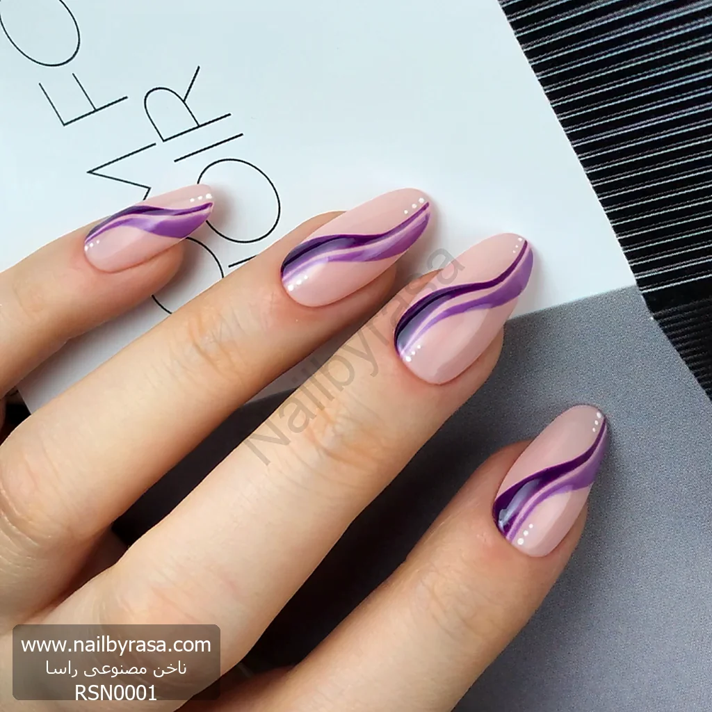- خطوط موجدار (Swirls): خطوط منحنی بنفش و یاسی روی بیس نود، هارمونی جذابی ایجاد کردهاند. این سبک طراحی در دسته ناخن مصنوعی مینیمال و هنری قرار میگیرد که بسیار پرطرفدار است.